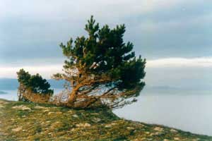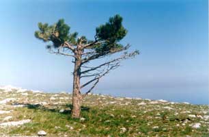 On the plateau the small groves of the Crimean pine are, which tops for all trees of this grove are broken off. A strongest wind permanently blowing on the plateau, break off tops of trees. And grove of trees with the broken off tops stay on the plateau, reminding any fancy landscape. On the plateau a wind with rate up to 50 m\s - 180 kilometers per hour are usual matter! A Crimean pine exotic low heigh with the tops, broken off by strong wind grows there. Stranger show is represented a single trees. As the winds have a usually defined direction, branch of trees are directional to one side. And these trees - feathers stayed, pointing to dominant wind direction in the given district.